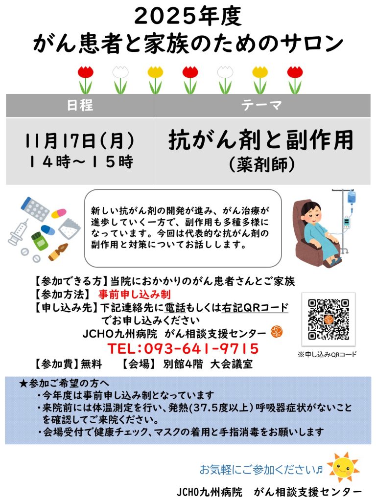 「がん患者さんと家族のためのサロン」では、療養に役立つ講演と悩みや疑問を気軽に語り合える時間を設けています。