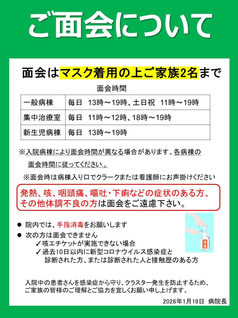当院の面会については次のとおりとなっております。ご理解とご協力のほどよろしくお願いいたします。