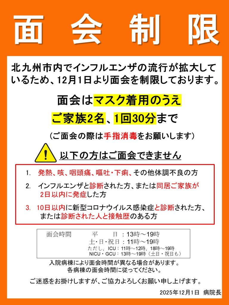 入院中の患者さんを感染症から守るため、令和7年12月1日より面会制限を実施いたします。